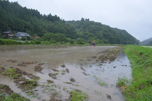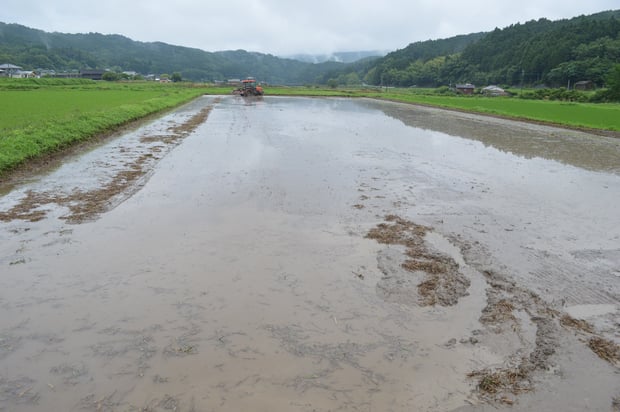 代掻き後は田んぼの土壌を落ち着かせるために、田植えまで3日ほどあけます。