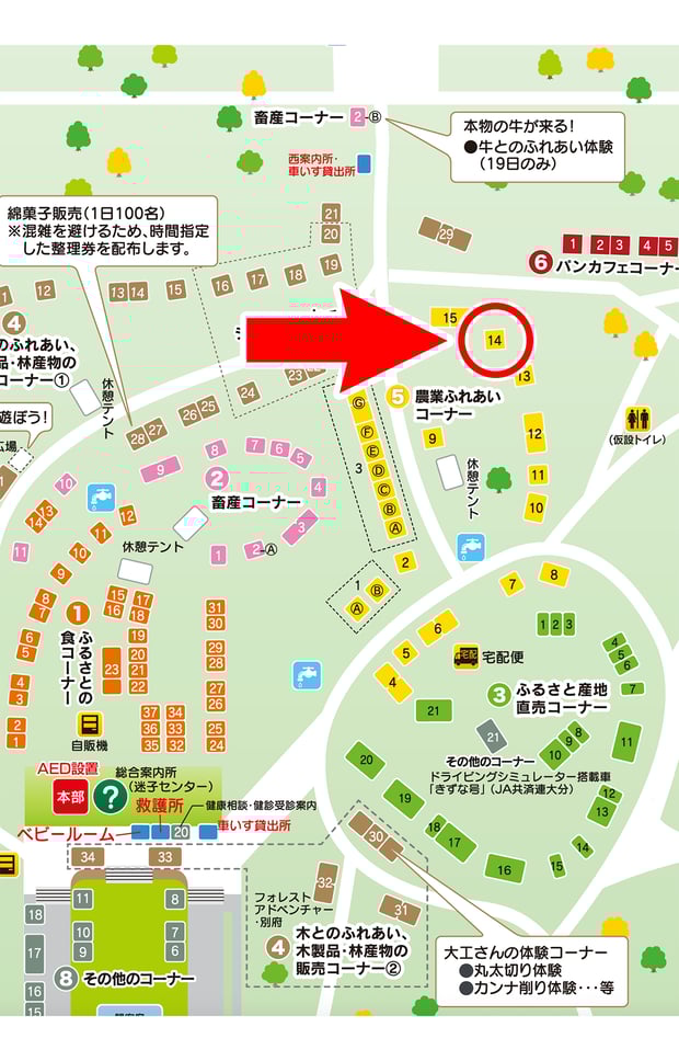 出店場所は、⑤農業ふれあいコーナーの14番です。